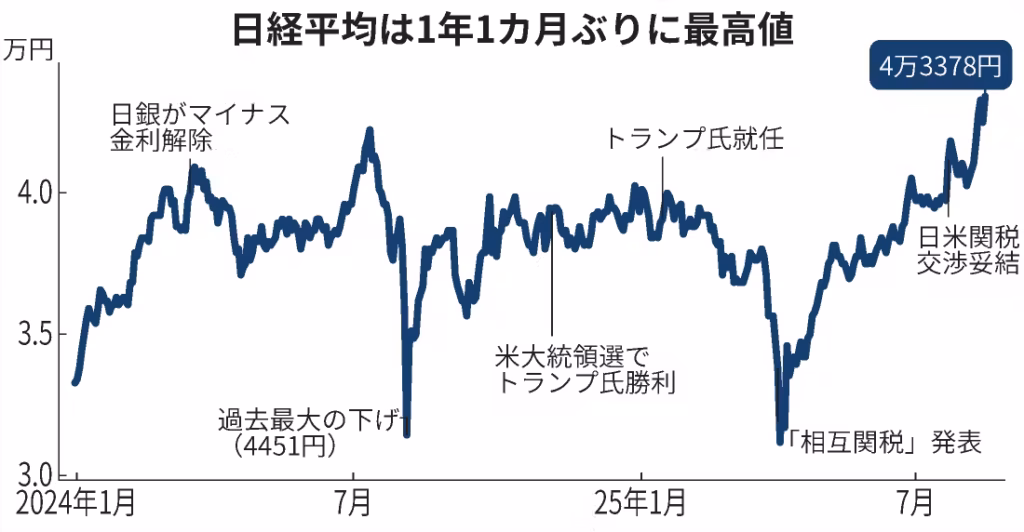 2025年8月12日、日経平均株価は前営業日比897円高の42,718円となり、約1年ぶりに最高値を更新しました。この記事では、株高の背景と市場の動向が詳しく分析されています。